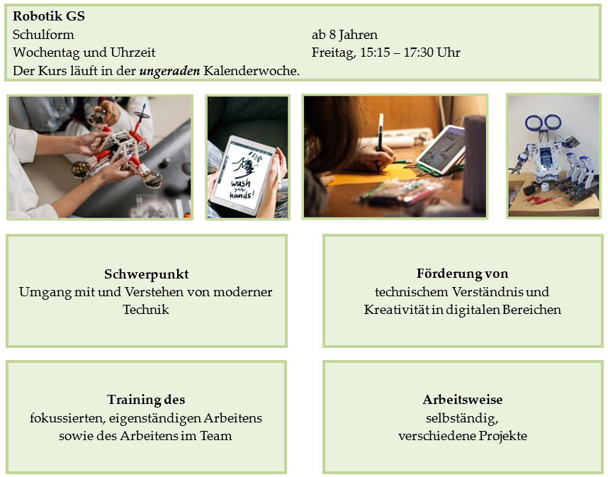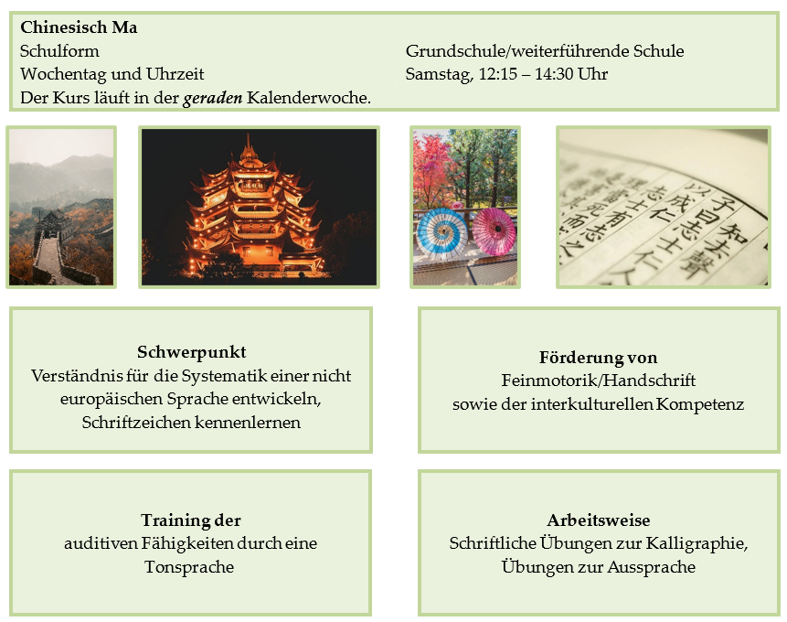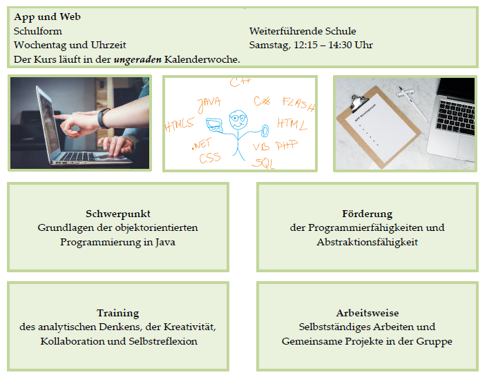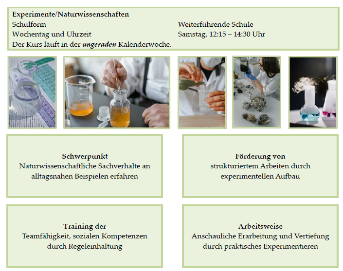 Sie finden hier lediglich eine begrenzte beispielhafte Auswahl unseres Kursangebots. Unser vollständiges Kursangebot mit Kursübersichten und Kurskonzepten findet sich im Login-Bereich für Eltern (oben rechts). Das Passwort dazu sowie nähere Informationen erhalten Sie nach telefonischer Rückfrage.
