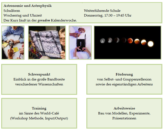 Die Zusammenstellung des Kursangebots basiert auf langjähriger Erfahrung mit den besonderen Interessen überdurchschnittlich intelligenter Kinder/Jugendlichen. Die Angebote werden den individuellen Bedürfnissen unserer Kurskinder entsprechend regelmäßig aktualisiert und erweitert.