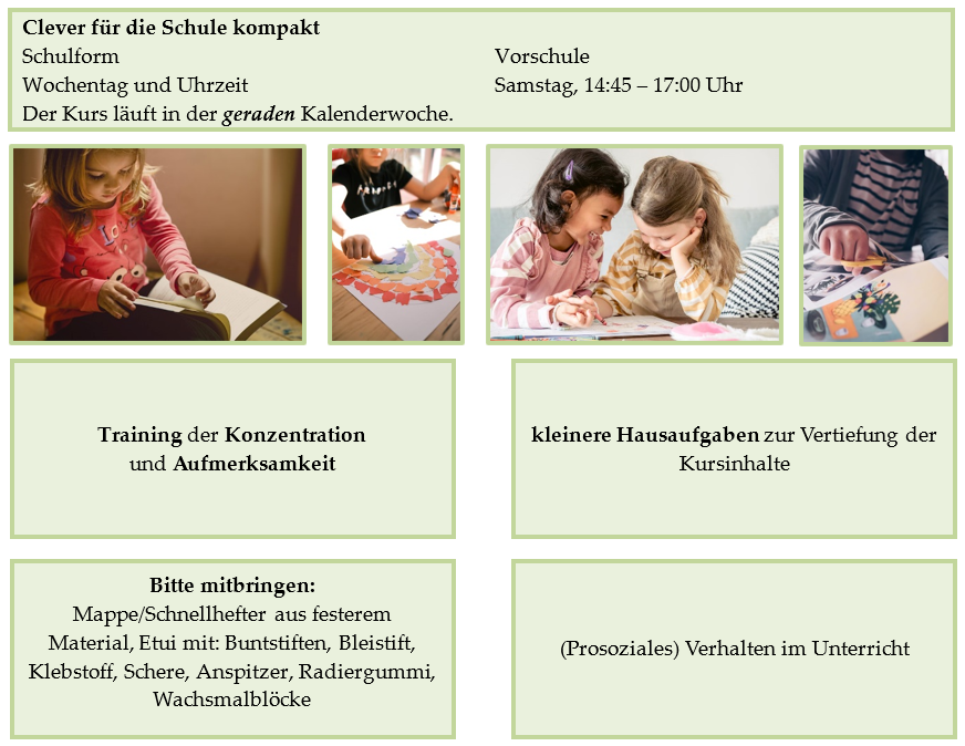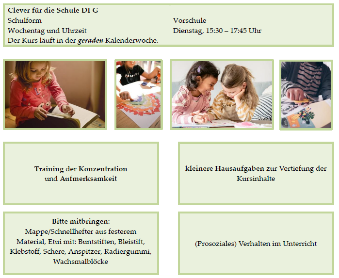 Dies sind beispielhafte Kurse. Um für Ihr Kind die passgenaue Fördermaßnahme bestimmen zu können, rufen Sie uns bitte an.